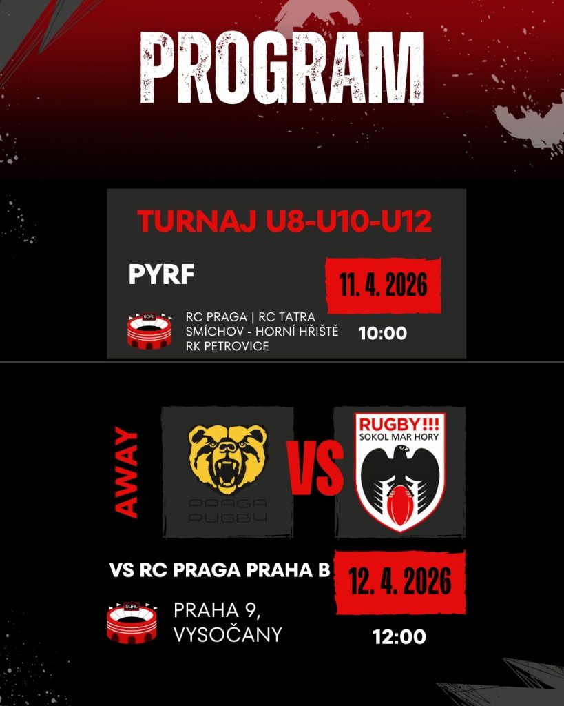 V sobotu 11. dubna 2026 se naše mládežnické kategorie zúčastní turnaje PYRF, který se koná na několika hřištích v Praze. Kategorie U8 odehraje svá utkání na hřišti RC Praga, kategorie U10 nastoupí na hřišti RC Tatra Smíchov a kategorie U12 se představí na hřišti RK Petrovice. Pro všechny mladé hráče se jedná o důležitou příležitost získat herní zkušenosti a dále rozvíjet své rugbyové dovednosti.